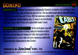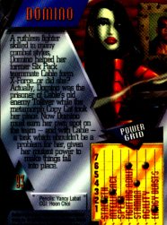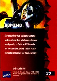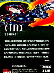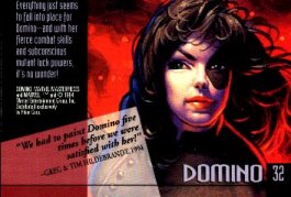 "Domino is a consummate team player when the chips are down--where X-Force is concerned, that's always. In a recent skirmish with a re-vamped Nimrod, Domino successfully held her own, then worked in unison with the rest of X-Force to stop him. Things always fall into pace when Domino is around