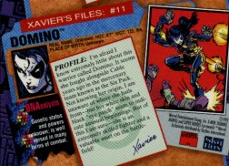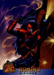 Profile:Whether the mysterious and beautiful Domino is a mutant or not, one thing is clear: things have a way of falling into place for her. She has defied death side-by-side with Cable in the Wild Pack, the Six Pack, and X-Force. With her extensive combat skills and her aggressive fearless fighting style, it's easy to see how Domino could earn a place with X-Force and capture their leader's heart.
